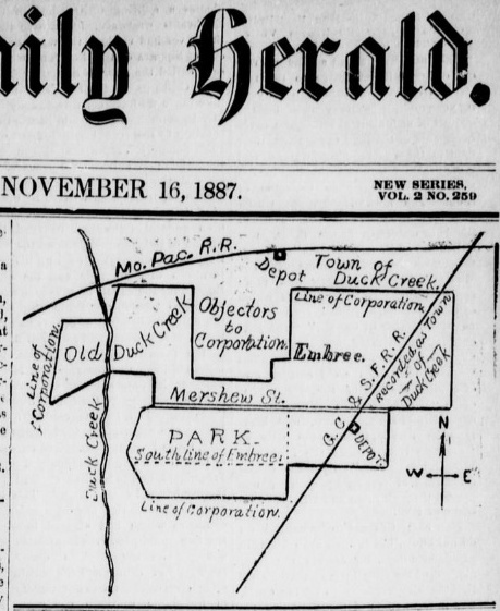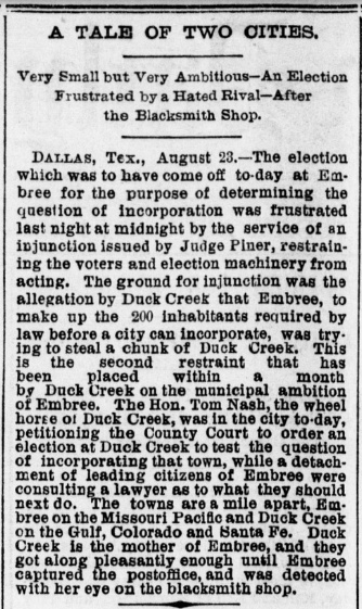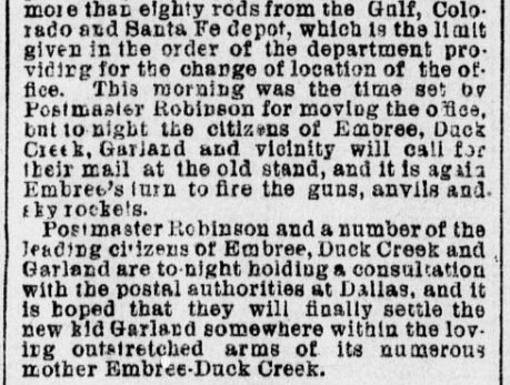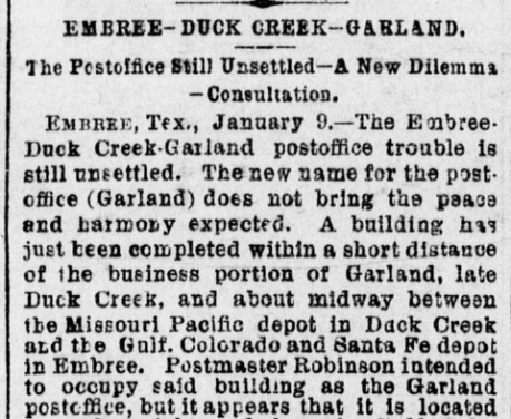 organizer, had held a very important part-time job: Postmaster for Duck Creek. Per the above report in the Galveston Daily News, MP had decided that "...the town will not be removed." Santa Fe tried to convince MP to forego naming their depot Duck Creek. Embree was only a quarter mile from MP's planned depot site, but MP stuck to an agreement they had made with Duck Creek (below, Fort Worth Daily Gazette, July 22, 1886.) The Duck Creekers were also convinced that relocating their businesses to the "new" Duck Creek would prevent their post office from being moved to Embree. ![]() |