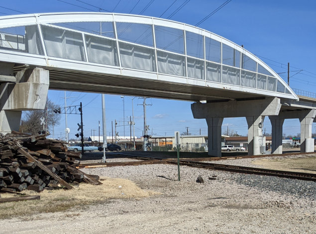 Rapid Transit (DART) light rail bridge over the former Santa Fe tracks dominates