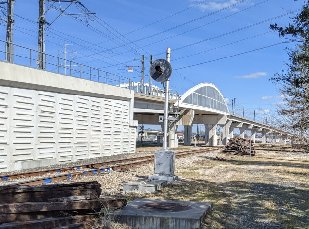 the distance belies the curve of the track to the right, parallel to the bridge,