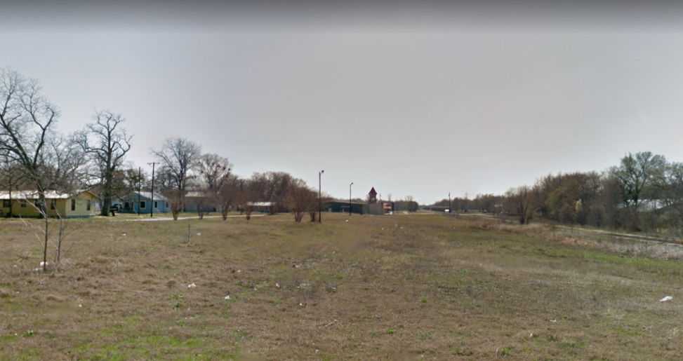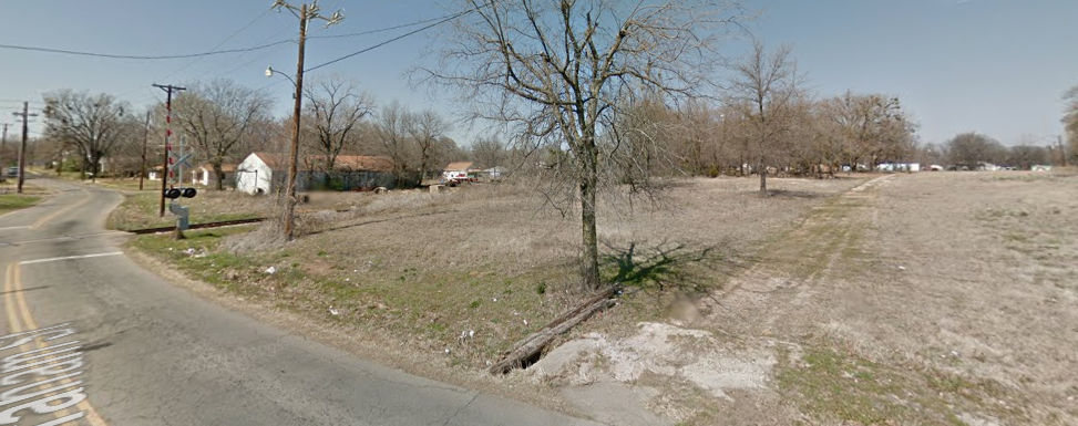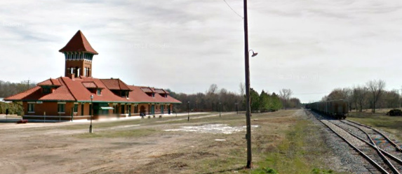 gates.)![]() Above: The open area between Paris Union Station and the main track west of the depot was historically used for passenger tracks (note poles for platform lighting still in place.) This view is to the south from the Bonham St. grade crossing. The station now hosts the Valley of the Caddo Museum and Cultural Center. (Google Street View, March 2013) |