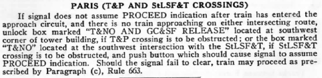 angle suggests this was mostly open prairie in 1957.![]() Below: T&NO Employee Timetable #33 issued June 2, 1940 explained how to override the automatic interlocker at Paris should it not properly issue a PROCEED indication. The T&P crossing control box was at the "southwest corner of tower building" (which was no longer staffed after 1933.) The control box for the crossing of the Frisco spur north of the tower was on a post at the "southwest intersection" of the crossing. |