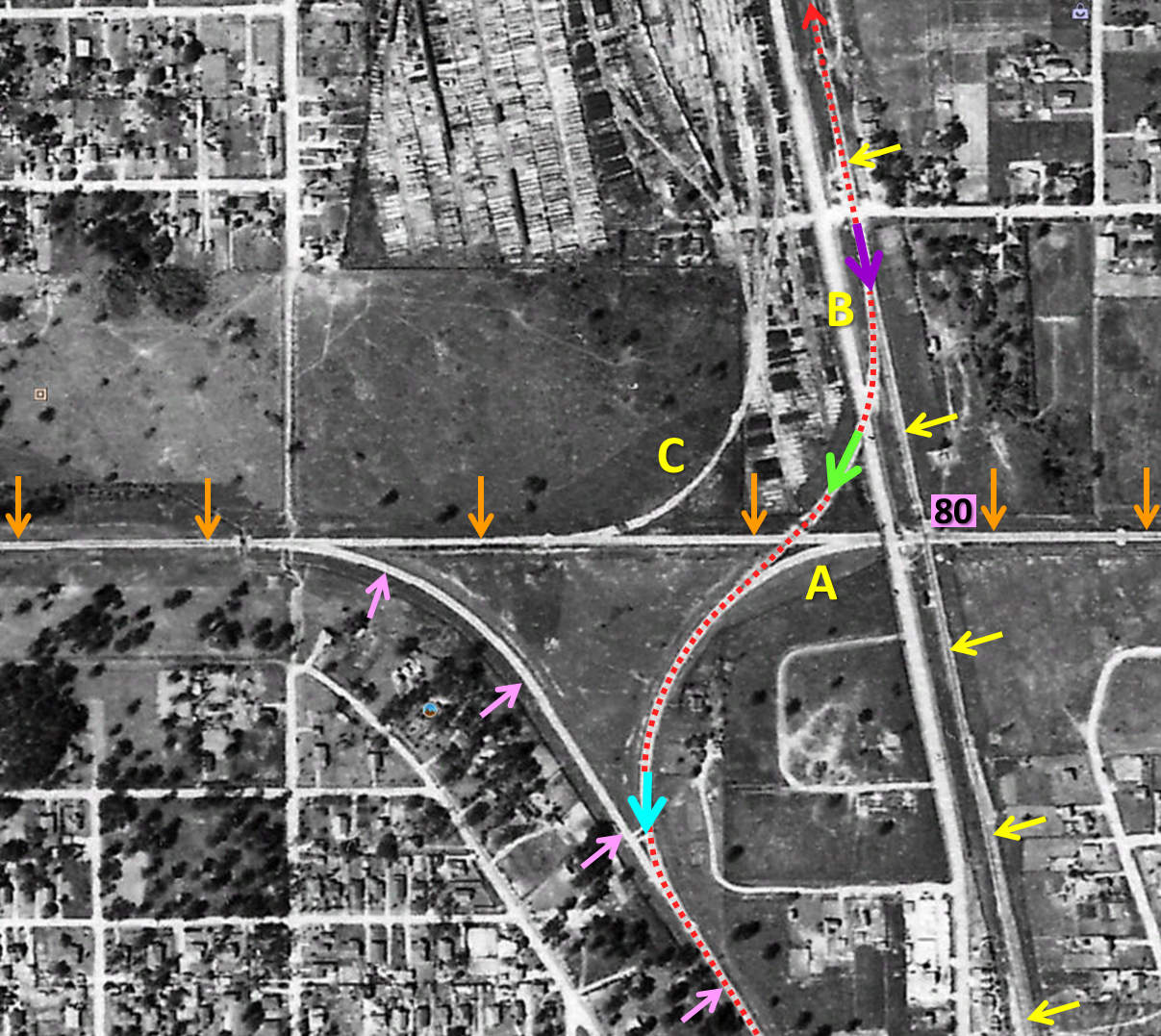 At least in recent times, there do not appear to have been any spurs between Oak Forrest Dr. and North Shepherd Dr., a distance of ~ 1.5 miles. So, if the switching rights related to the original construction, the T&BV and the HB&T would have met somewhere in this vicinity, with North Shepherd Dr. being about 3.5 miles west of Belt Junction, consistent with the 3.4 mile distance on Tom's Rock Island track chart.