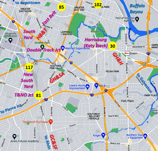 the eastern edge of SP's Englewood Yard north of Buffalo Bayou. HB&T