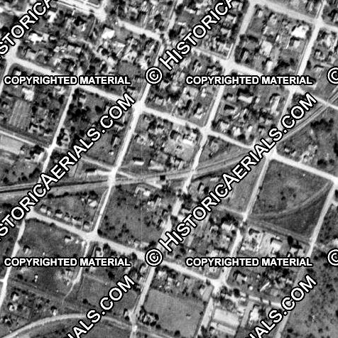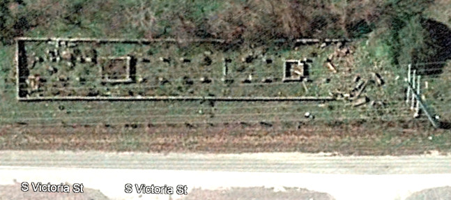 Left: This annotated aerial image of Victoria from January 21, 2017 shows that the SLB&M tracks ran down what is now E. 3rd St. The block distances to E. 2nd St. and E Water St. suggest that E. 3rd St. had been platted and may have been a gravel roadway prior to the City of Victoria granting an easement to the SLB&M. The SLB&M's arrival into Victoria was some thirty years after the other railroads in town, hence urban development made finding a right-of-way into downtown impossible without assistance from the City. Victoria's agreement with the SLB&M required the City to provide a free right-of-way through town and free land for SLB&M's yard and depots. The only land available was west of downtown near the Guadalupe River. (Google Earth image) |