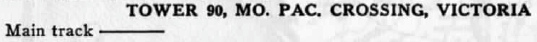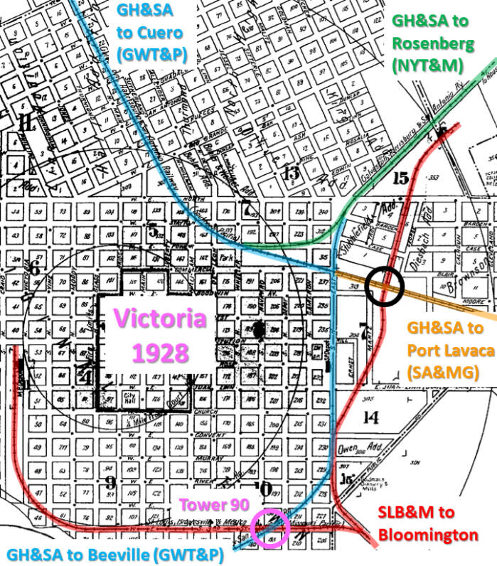 Victoria was an important population center and an endpoint for the SLB&M; the tracks from Bloomington did not proceed beyond Victoria. Frisco management anticipated significant traffic there, so a major yard with passenger and freight depots was built along the west edge of downtown, about two miles west of where the SLB&M crossed the GH&SA line to Beeville and a quarter mile west of the Victoria County courthouse. The railroads built a manned interlocking tower at their crossing, and it was commissioned as Tower 90 by RCT on January 3, 1913 with a 12-function mechanical plant. This was likely a typical minimal interlocker for a crossing that had no connecting tracks. The twelve functions would be a home signal, a distant signal and a derail in each of the four directions. The 1917 Sanborn Fire Insurance map of Victoria shows the tower to be a two-story structure, but no photos of this tower have been located.