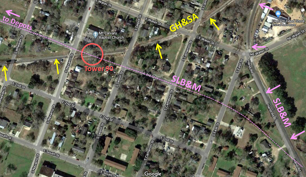 Tower 90. Below: With north to the right, the foundation remnants of the passenger depot on the west side of Victoria were still intact when Google Earth captured this satellite image in January, 2017. The depot and adjacent yard were abandoned in the 1970s and the land remains undeveloped. The GCL had become fully independent of the Frisco by 1915. Missouri Pacific (MP) then bought all of the GCL railroads in 1925. They became fully merged into MP in 1956. MP was acquired by Union Pacific (UP) in 1982. ![]() A 1938 T&NO Employee Timetable (ETT) shows Tower 90 located on the Beeville Subdivision, staffed from 7:30a to 4:30p daily except Sunday and legal holidays. It also shows that there was one whistle code for the Tower 90 operators ... ... which seems odd for a tower with no connecting tracks. Perhaps it was used to signal readiness to exit a nearby siding. A 1947 T&NO ETT shows that the hours had shifted slightly to be 8:00a to 5:00p and noted that when the operator was not on duty, the signals would be set to allow movements on the T&NO tracks. A 1949 T&NO ETT lists Tower 90 as an automatic interlocker. It is unlikely that the tower building survived much beyond this timeframe since the automatic plant could be housed in a trackside cabinet. The other SLB&M / GH&SA crossing (black circle on the map) was not interlocked and was within Yard Limits, handled by special rules. |
