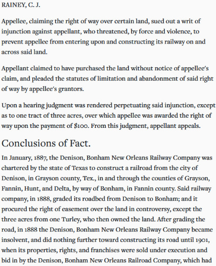 "The Katy had trouble in getting its track from the Red River to Denison, a distance of 6 miles. The H&TC had reached Denison in March, 1872, and had already graded its line to the Red River and had laid out a town on its south bank called Red River City. The Katy forces undertook to grade alongside the H&TC grade and on its right-of-way from the Red River to Denison, but were stopped by an injunction. An agreement was effected under which the H&TC abandoned Red River City, took up its tracks from Denison to Red River City, and entered into a contract for a joint station at Denison. ... At the same time, a close working agreement between the two systems was effected on traffic between Texas and Northern points."