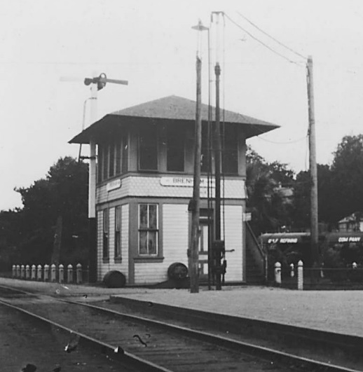 off the image to the left, adjacent to the crossing diamond. The rooftop sign says "BRENHAM" in the