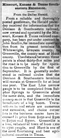 Left: The Denison Daily News of January 8, 1880 repeated a news item from another newspaper ("the Republican", location unknown) that a group of stock and bondholders of the Katy railroad had arranged the investment capital to buy both the D&S and the D&P. Supposedly the sale had been consummated during the first week of January and the lines would be combined into a new railroad, the Missouri, Kansas & Texas Railway Extension. This is an early reference to "Extension"; the railroad would ultimately become the Missouri, Kansas & Texas Extension Railway. Despite the apparent plans of the new management, the southeastern extension to Palestine only made it as far as Mineola. The southwestern extension, "150 miles" with no specified endpoint, ended up being northwest to Wichita Falls (and beyond into Oklahoma by acquisition.) Both extensions were executed by the Katy. Right: The Denison Daily News of April 15, 1880 reported that a contract had been let to John Scullin to extend the rail line from Whitewright to Greenville. The article references the railroad as the "Denison & Southeastern railroad, now owned and operated" by the Katy. The reporter may not have been aware that D&S had been re-chartered a month earlier as the Missouri, Kansas & Texas Extension Railway. The story conveys the reality on the ground that this was a Katy operation all the way, regardless of who owned the tracks and when the legal paperwork might catch up. It is interesting to note that the contractor, John Scullin, had been one of the founders of the D&P. |