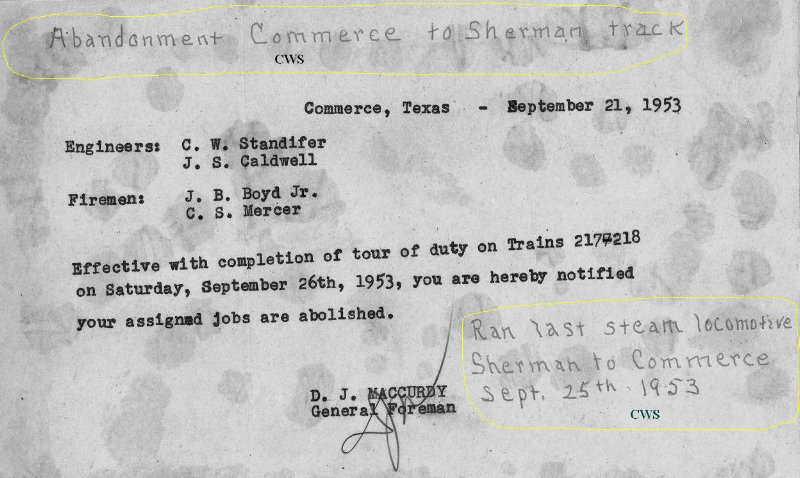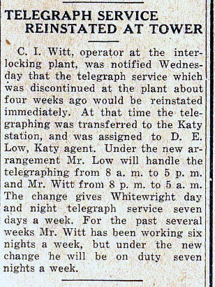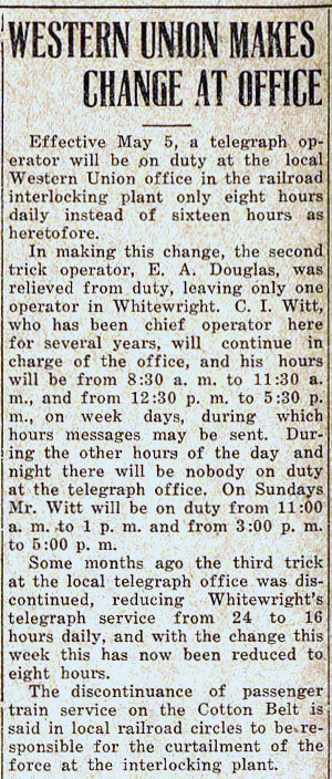 service provided by the railroads to the Whitewright community. Left: The Whitewright Sun newspaper of May 5, 1932 detailed that telegraph operations in the "interlocking plant" were becoming daytime only, 8 hours per day. The story mentions that months earlier, the service had been cut back from 24 hours to 16 hours. This appears to have resulted from a staffing reduction in the tower that was blamed on the Cotton Belt eliminating passenger service to Whitewright. The story implies that previously, there had been a late night Cotton Belt passenger train that had justified the need for 24/7 staffing in the tower. Right: A year later, the Whitewright Sun reported on July 13, 1933 that daytime telegraph operations were being moved from the tower to the Katy depot. Apparently, a change to the Cotton Belt's schedule resulted in the need for a tower operator overnight and eliminated the need to staff the tower during the day. The implication is that under the revised schedule, the Cotton Belt ran zero trains through Whitewright during the day, so it was acceptable to line the signals for unrestricted passage on the Katy and leave the tower unmanned. |