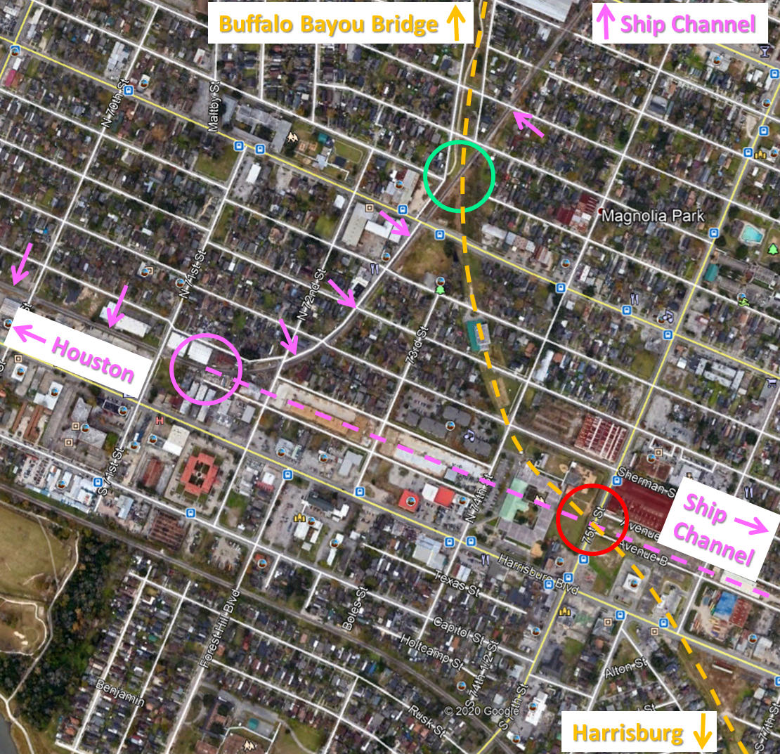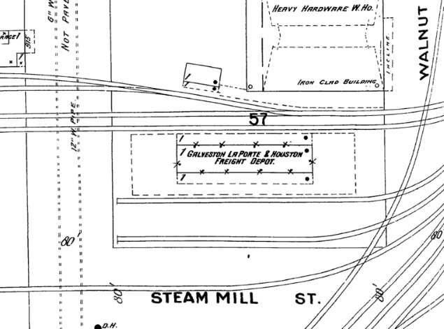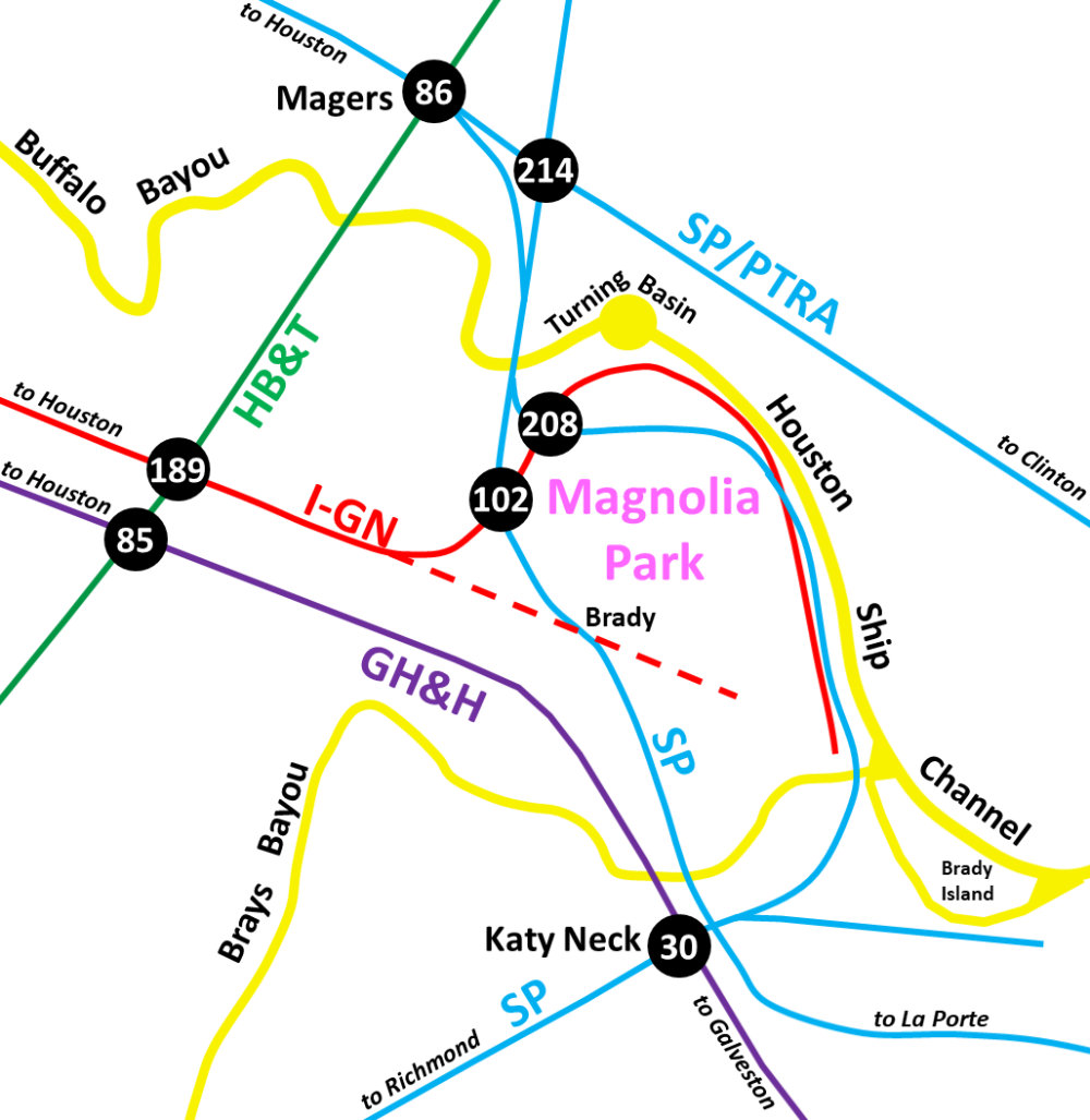 which crosses the HB&T (ex-I-GN) Magnolia Branch at the future Tower 208. The