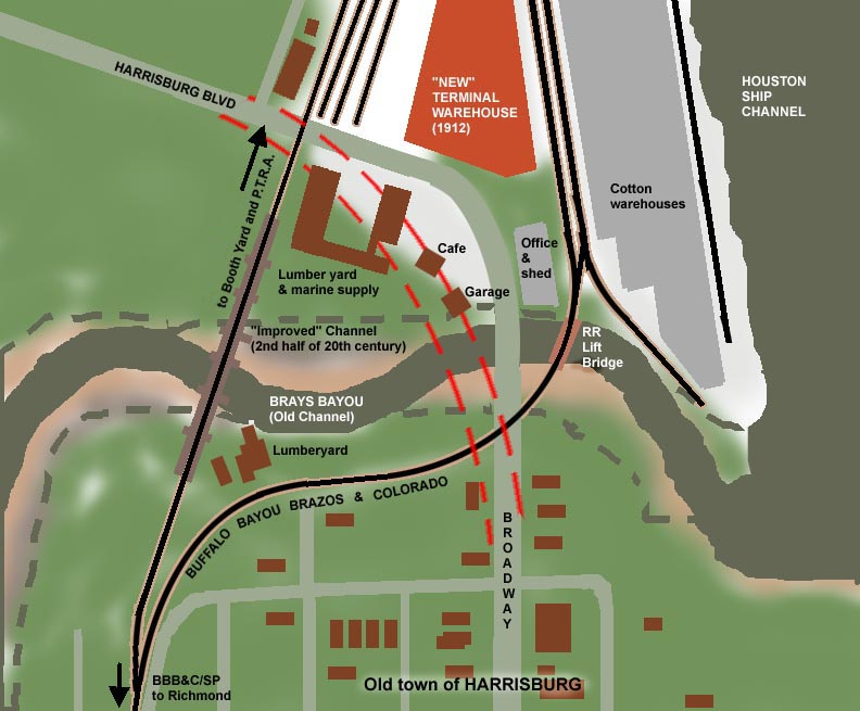 bridge toward the camera swing to the southeast and cross the HB&T tracks at