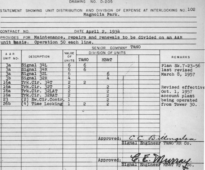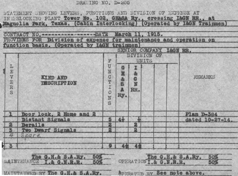 was always 9 functions which RCT corrected in its 1923 list. There are three clues in this drawing that suggest Tower 102 had been planned originally as a manned tower. Generally, no division of operation expenses is listed for a cabin interlocker since the cabin is not manned; train crews operate the controls as part of their regular job duties. Yet, this drawing shows operating expenses divided equally between the two railroads, followed by "See note above." to explain that actually, I&GN trainmen would be operating the controls (hence, no tower staffing costs to split.) Also, "(Cabin Interlocking)" and the twice-appearing "(Operated by I&GN Trainmen)" are parenthetical, as if they were explanatory amendments to an original drawing. |
