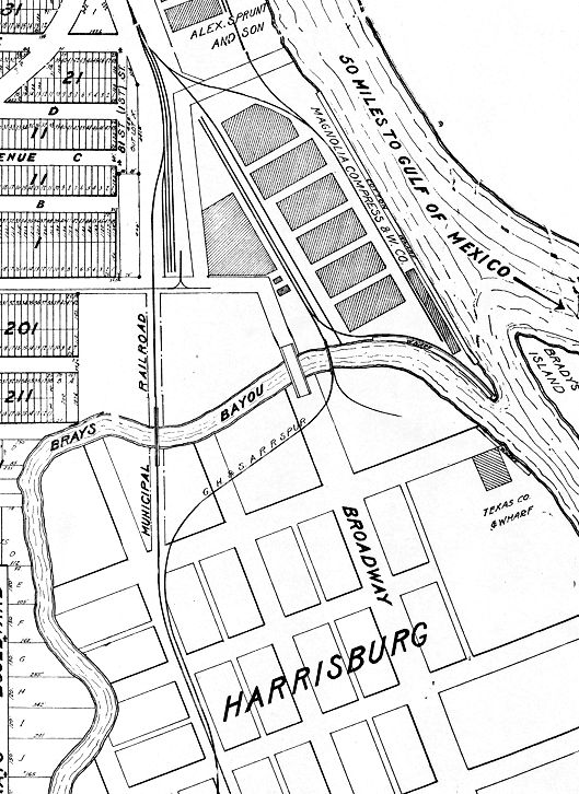 with Buffalo Bayou at left meandering toward Galveston Bay. The town of