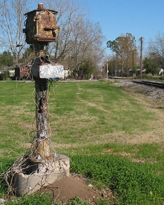 responsibility for what became known as their Magnolia Branch. On July 23, 1956, the interlocker plan was revised with a new sketch ("Sk.") of unknown changes. The plan was then updated on March 8, 1957 to conform to the new sketch. The 8 month period between the finalization of the sketch and the implementation of the plan may indicate that construction work was required, which might be related to a known connecting track at the crossing. On October 1, 1957, the document was updated to show that Tower 30 had taken over responsibility for remote control of the Tower 102 interlocking plant. Sometime later, the remote control was removed and a manual gate was installed (photos at top of page.) |