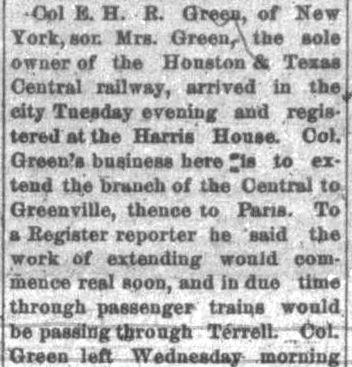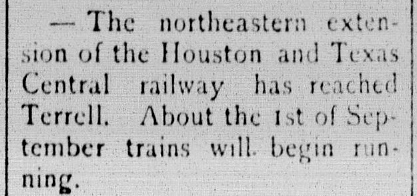 Left: The Brenham Daily Banner of August 19, 1882 reported the tracks reaching Terrell, imprecisely using "Houston and Texas Central" instead of "Texas Central". The legal separation was for convenience, the ownership was virtually the same, and it arguably was a "northeastern extension of the Houston and Texas Central Railway". This date sets a floor for how early the tracks were laid to Roberts. Notably, Roberts was on land purchased by the TC on October 26, 1882 from Governor Oran M. Roberts (who would leave office three months later.) A 1981 book by Charles Zlatkovich asserts 1884 as the year the extension was built, and this timeframe has been echoed in other histories... |