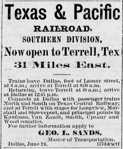 That same day, this ad first appeared announcing train schedules between Dallas and