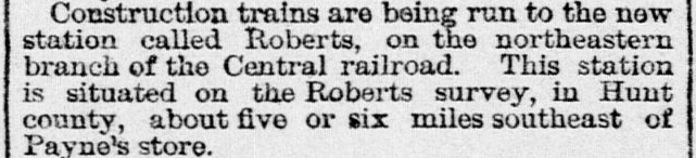 ...but...Above: The Galveston Daily News of November 11, 1882 reported construction trains operating to Roberts, which suggests completion by early 1883. Quinlan, named for a Texas Midland Director, was later established as a new town 1.5 miles north of Roberts...which faded away. |