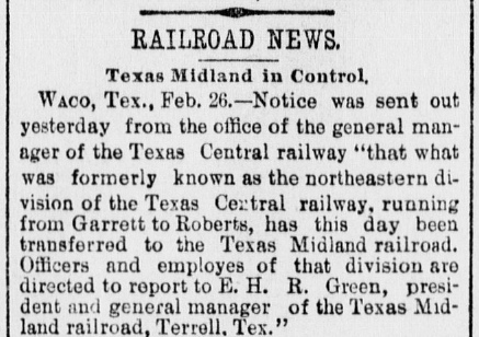 subsequent W&NW auction, which was won by SP. Left: The northeast branch of the Texas Central became officially owned by the Texas Midland on February 25, 1893, as announced by the Galveston Daily News of February 28, 1893. |