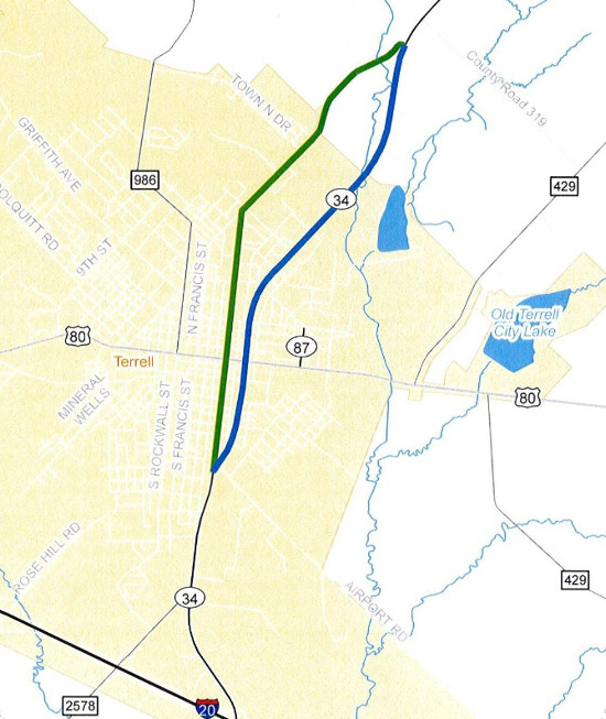 in Terrell to follow the TM right-of-way (blue) from the Airport Rd.