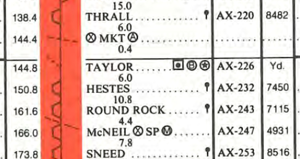 January 7, 2005) Below: This 1985 MP employee timetable shows the SP crossing at McNeil with a circled M to indicate a mechanical interlocker. Compare with the MKT crossing 0.4 miles east of Taylor, which shows a circled A, for an automatic interlocker. ![]() |