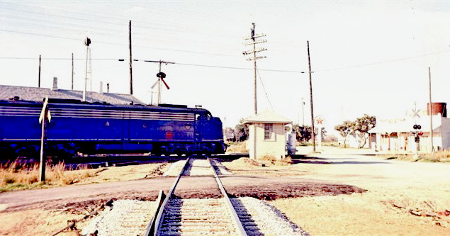 A southbound MP locomotive crosses the diamond while SP's train waits in the