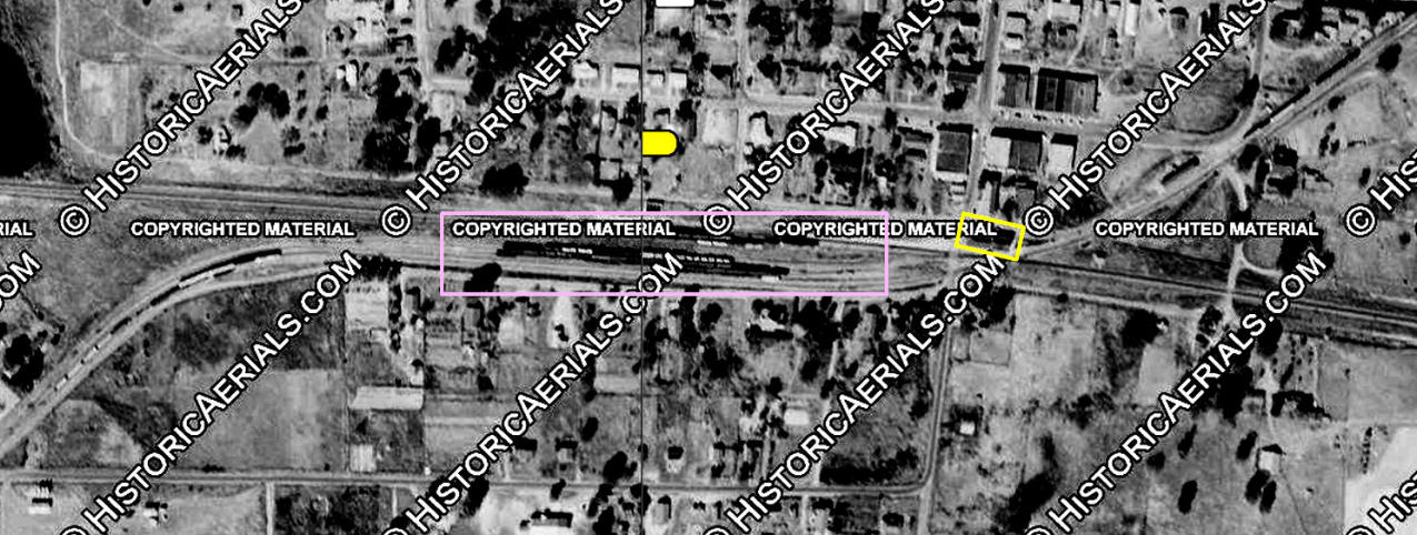Left: This H.D. Connor photo of the Big Sandy depot was taken in 1956 as an eastbound T&P passenger train crossed the diamond. This image of the depot shows the evolution from its original construction after the 1906 fire. The dome remains in place, but the east porch has been removed. The date of the final demise of the depot can be narrowed to the 1985 - 1996 timeframe based on aerial imagery. |