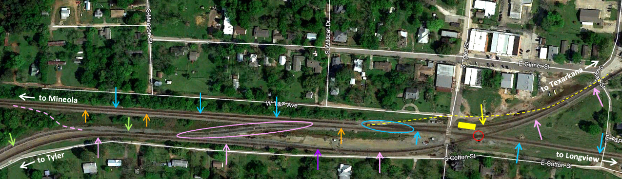 (yellow arrow) departs the former T&P main line to transition to the former