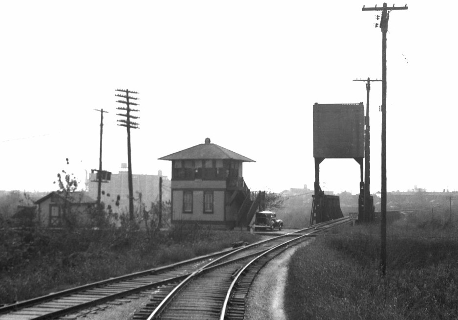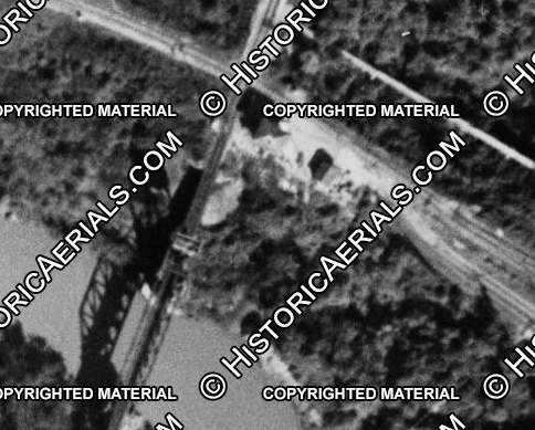 single-track bridge and the HB&T bascule bridge. Below: Casting a large shadow that almost reached the diamond, Tower 139 was still intact when this aerial image ((c) historicaerials.com) was captured in 1947. The date of the tower's final demise is undetermined. ![]() |