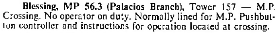 would have been on the other side of SP's tracks. Mounted atop the pole is a metal box that formerly held pushbutton controls for the electric interlocker that replaced the mechanical plant originally installed. The date this change was made is undetermined. There is, unfortunately, a gap of 23 years in aerial imagery between 1958 and 1981 during which the cabin was dismantled and the interlocker replaced. The interlocker change can be dated to between 1977 and 1981 because a MP Employee Timetable (ETT) from October, 1977 reports the interlocker at Blessing as a mechanical plant, presumably with the cabin still present. A Southern Pacific ETT dated October 31, 1982 (below) says that a pushbutton controller was in use, undoubtedly housed in the control box atop this abandoned pole. ![]() |
