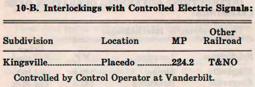 Left: A 1919 Employee Timetable (ETT) issued for the GH&SA by the U. S. Railroad Administration (which exercised Federal control of the railroads during World War I) incorporates this passage to explain the presence of gates at non-interlocked crossings (which in 1919 included Placedo) and how the gates should be operated. |