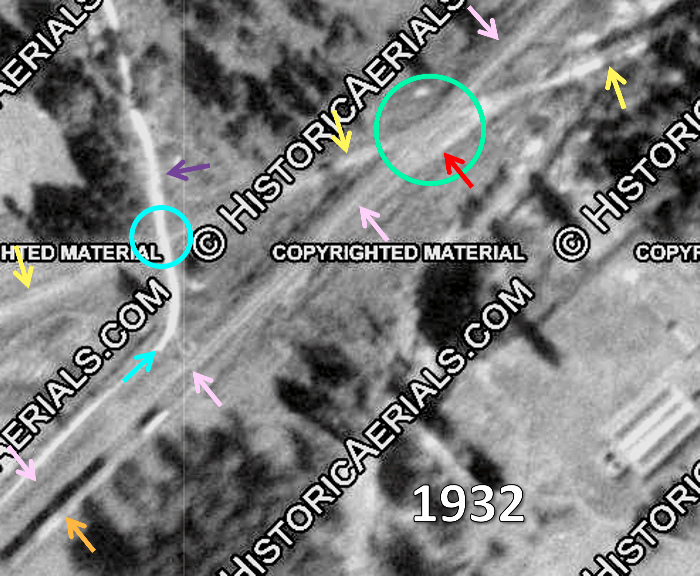 (c) historicaerials.com) T&NO tracks (pink arrows) and WBT&S tracks