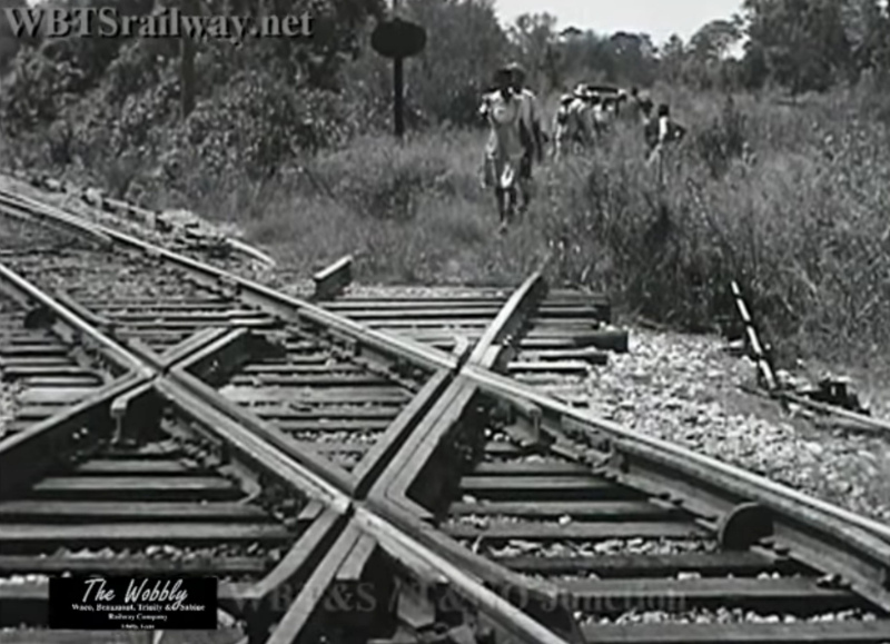 the website wbtsrailway.net. This image capture is taken from the video and is facing generally west-southwest down the WBT&S from the Tower 168 diamond. The passengers are walking toward tracks in the foreground belonging to the Texas & New Orleans (T&NO) Railroad, the principal operating company in Texas and Louisiana for Southern Pacific (SP.) Whether they were planning to be picked up by the next T&NO train or merely walking into Livingston is unknown. They had disembarked from a trailer pulled behind the Model A (barely visible in the distance.) The video shows the Model A being turned 180 degrees for the return trip to Trinity using a car jack and a lot of manpower. The trailer was manually pushed onto a nearby siding and recoupled to the Model A after it passed on the return trip. Note that the WBT&S south rail at the diamond has been cut on both sides of the T&NO west rail, i.e. the WBT&S was no longer capable of crossing the T&NO. The apparatus with the slanted pole to the right is very likely part of the "ground lever" control used by the Tower 168 plant. Hypothetically, it could still have been in use to set a STOP signal on the T&NO, perhaps to indicate the presence of passengers at the diamond. |