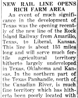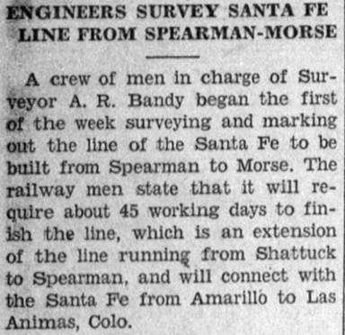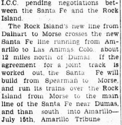 disrupted. Left and Right: The Rockdale Reporter of August 1, 1929 noted that the recent completion of Rock Island's line between Amarillo and Liberal resulted in the founding of several new towns in the Texas Panhandle, including Morse. Morse was significant because it soon became the target crossing point for an extension proposed by Santa Fe to connect Amarillo with their existing branch line at Spearman, 18 miles northeast of Morse. |