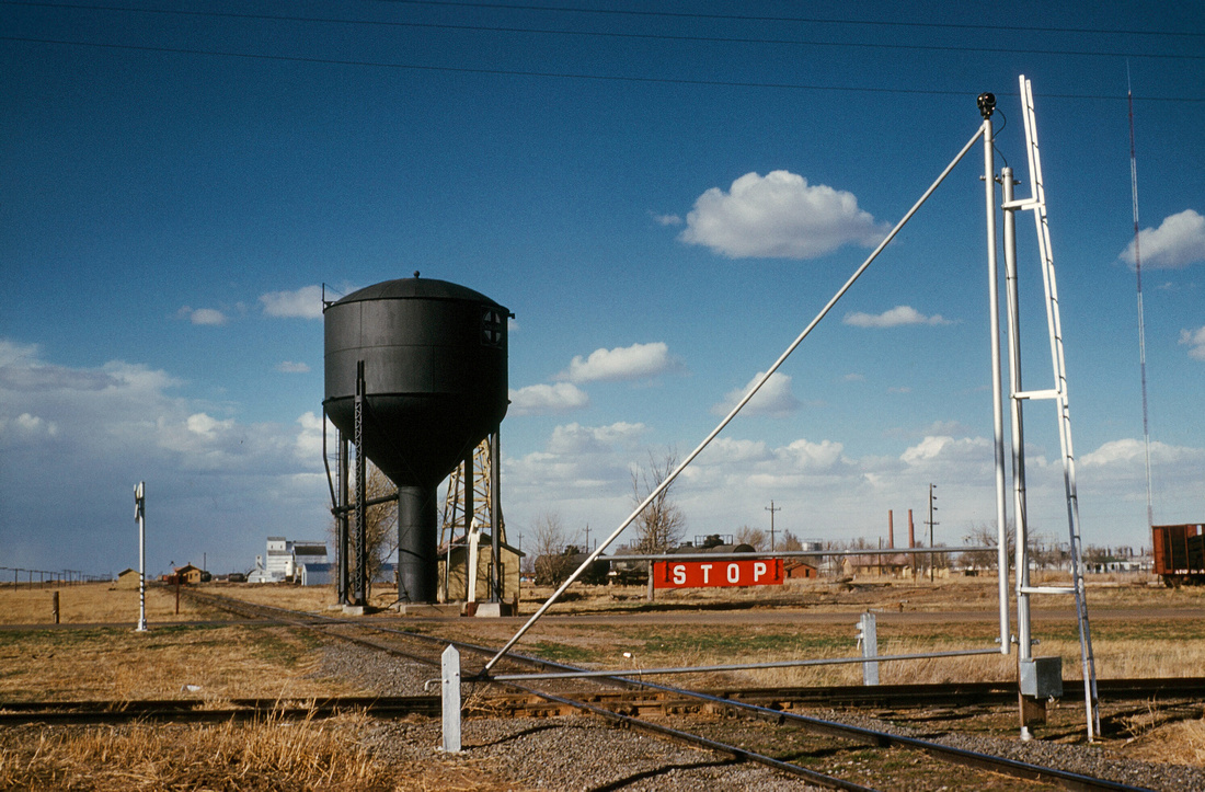 with the P&SF water tower. The Rock Island tracks cross horizontally in the foreground.