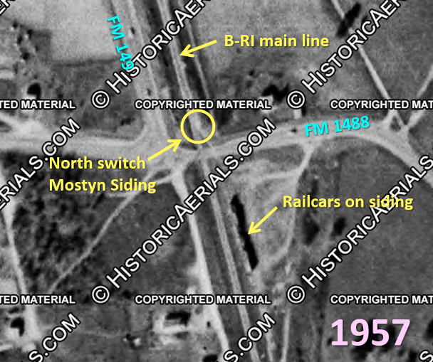 arrows) crossing the B-RI main line (blue circle) north of Mostyn at latitude 30 13 52.6 N, longitude 95 41 33.1