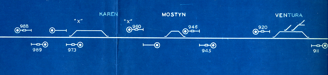 | Below: South is to the right in this 1952 track chart supplied by Tom Kline. The numbers are mileposts with decimal points removed. Milepost 95.34 places the tram crossing at Tower 180 a bit north of the Mostyn siding, for which the south switch signal was located at milepost 94.6. |