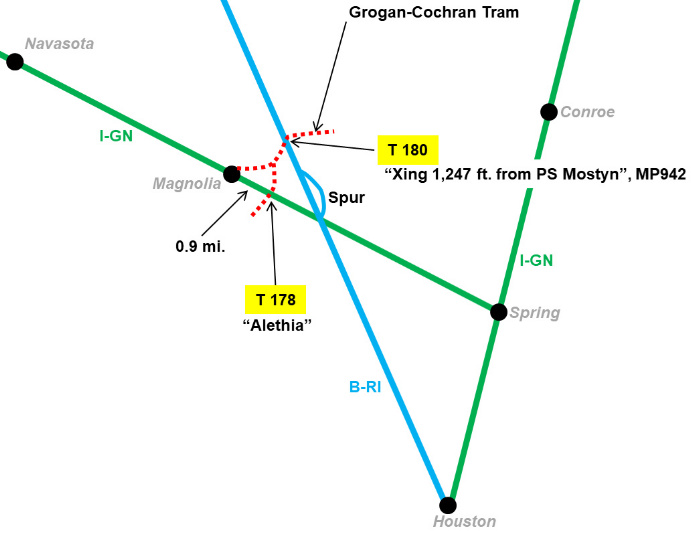The last riddle to solve is ... can the identified right-of-way (green arrows, above right) be proven to have belonged to the Grogan-Cochran Lumber Co.? The solution has become available with aerial imagery from 1930 released in recent years. The entire tram line can be followed from the Tower 178 crossing at Alethia to the Tower 180 crossing north of Mostyn. Since Alethia is known to have been the site of a Grogan-Cochran mill, being able to follow the tram right-of-way all the way to Tower 180 confirms MP's letter ("The tram line shown is the same one that crosses our Ft. Worth line at Magnolia.") and thus Grogan-Cochran's ownership of the crossing north of Mostyn. Unfortunately, the 1930 imagery lacks sufficient detail to improve the location estimate (above) for the north siding switch.