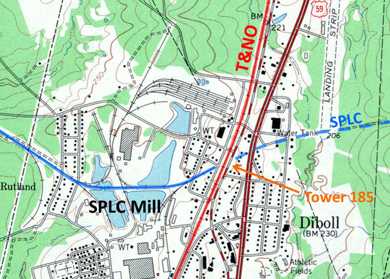 Diboll. At right, the former SPLC spur that crossed the T&NO at Tower 185