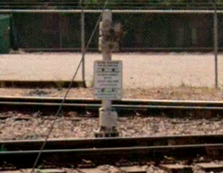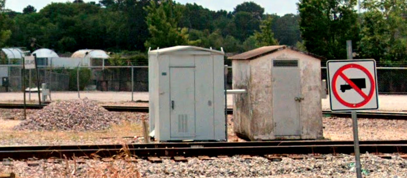 location, now flanked by its replacement (white roof.) Below: This Google Street View from June, 2022 looks southwest along the exchange track from near the BNSF (ex-Santa Fe) connection. An orange derail and a warning sign protect the main line from potential loose cars on the exchange track. The depot lead appears to have been removed as no switch is evident. ![]() |