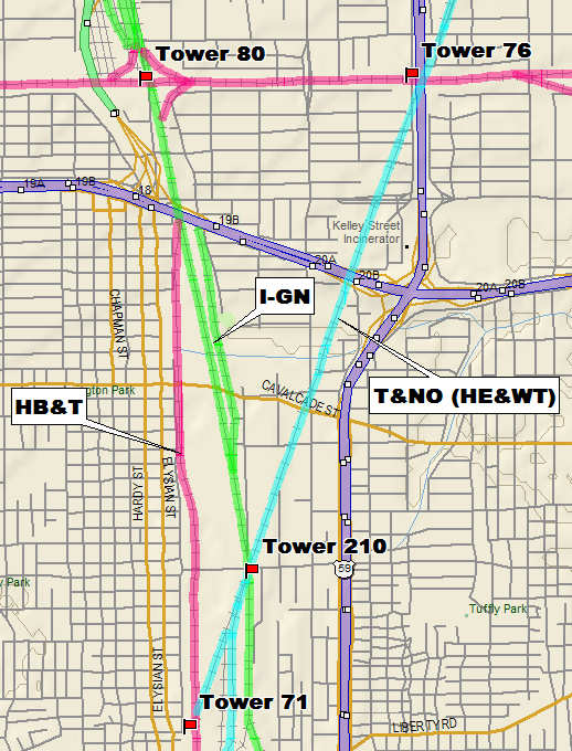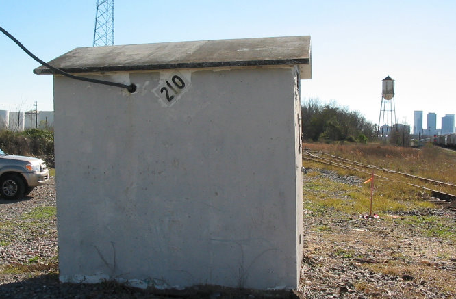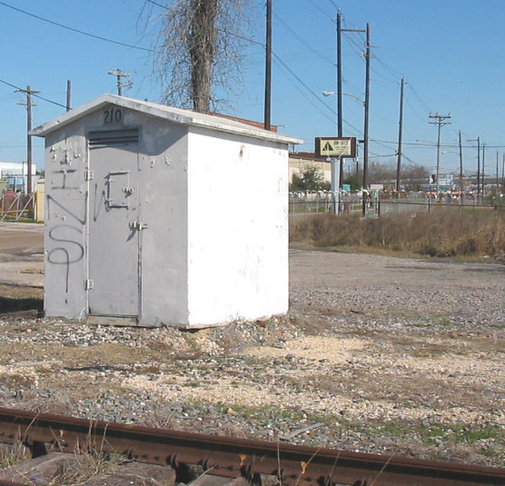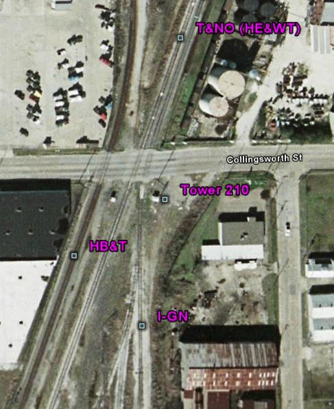 Tower 210 was established as an electric interlocker in 1961 to control the crossing of the T&NO Lufkin Line (former Houston East& West Texas main line) and the Houston Belt & Terminal (HB&T) Railroad (former International - Great Northern line) at Collingsworth St. in north central Houston. The interlocker was remotely controlled by Tower 26, and is now controlled by Union Pacific Operations.