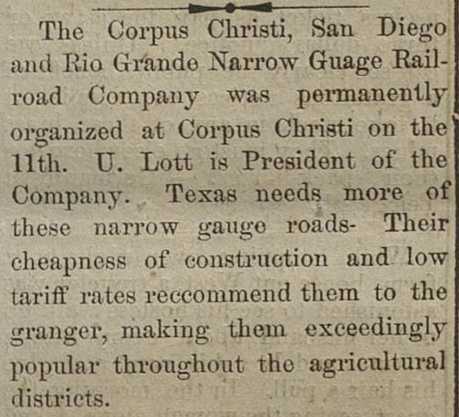 dated August 16, 1875 noted that the CCSD&RG had established its headquarters in Corpus