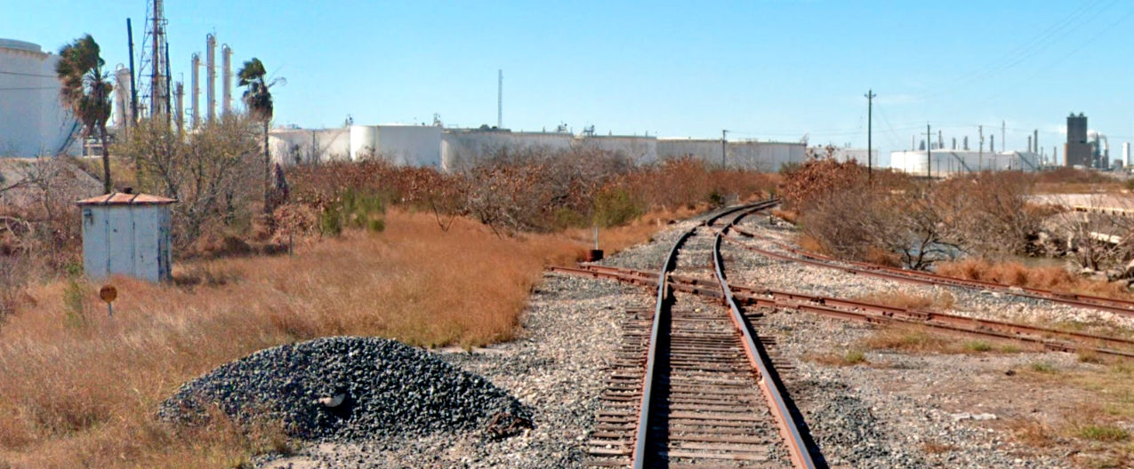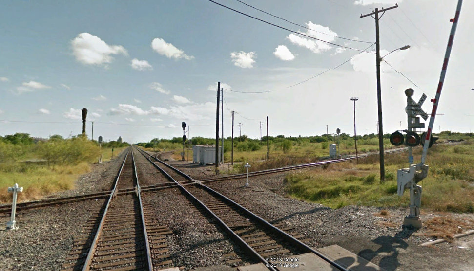 Left: This Google Street View image in Robstown looks south along UP's main track to Harlingen. In the foreground, the TM crosses the Tower 197 diamonds. Just beyond the equipment cabinets near the center of the image, the connector for traffic to Laredo is visible as it begins to curve to the right toward its connection with the TM about 0.4 miles west. |