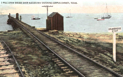 The earliest railroads in Texas were dependent on ports along the coast to receive construction materials, particularly rails from east coast mills. Wagon roads into the interior of the state were not suitable for hauling heavy cargo. Thus, the earliest railroads literally built out from ports hauling rails and other materials over newly laid tracks to forward construction teams using locomotives and railcars that had also been received through the port. One such railroad was the Corpus Christi, San Diego and Rio Grande (CCSD&RG) Narrow Gauge Railroad chartered in March, 1875 to build west from the port at Corpus Christi to the Rio Grande River. The destination was the border towns of Eagle Pass and Laredo by way of the community of San Diego. Corpus Christi did not have a deep water port, so the ships carrying iron rails for the CCSD&RG very likely tied up at offshore locations along Mustang Island and had their cargoes lightered into Corpus Christi in shallow draft boats. The CCSD&RG and the other railroads that followed helped to stimulate local commerce and grow Corpus Christi's population. Growth in turn led to the eventual construction of a deep water port; serving the port became a profitable business for the railroads.