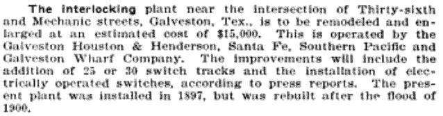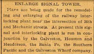 Mechanic streets...". Santa Fe built Tower A c.1897 near the hypothetical intersection of 36th and Mechanic streets, hypothetical because 36th Street is not known to have ever extended all the way to Mechanic St. The intersection appears to have existed only on the official plat of Galveston. Tower A had the first interlocking plant in Texas; this was presumably the rationale for the 'A' name given by Santa Fe. |
