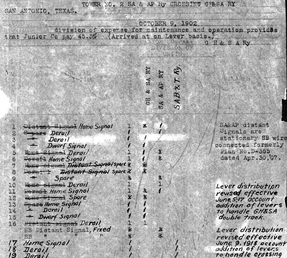 By the end of 1930 when RCT published its final comprehensive list of active interlockers, the function count at Tower 105 had grown to 36 functions. The sudden change from 17 to 36 functions was reported in RCT's interlocker list published at the end of 1923. The large growth in the function count is attributable to several factors, among them the Union Stock Yards located immediately southeast of the crossing which grew as a destination for shipping cattle by rail. Also, GH&SA's line became double tracked c.1917, increasing the number of diamonds, hence more signals and derails (the fact that there was no change in the function count for Tower 105 reported by RCT after the known double tracking of the SP line leads to the conclusion that at least some of the increase from 17 to 36 in 1923 was a documentation correction for cumulative function changes that had occurred in the interim.) I&GN's line was double tracked through this crossing at least by 1918 (per track chart at top of page), but whether this occurred before or after Tower 105's construction in 1916 is undetermined. Despite the presence of the Katy nearby, the Katy was never listed as a participant in the cost-sharing for Tower 105, at least through the end of 1930. This leads to the assumption that the Katy connector in the foreground of Barriger's photo was owned by I-GN.