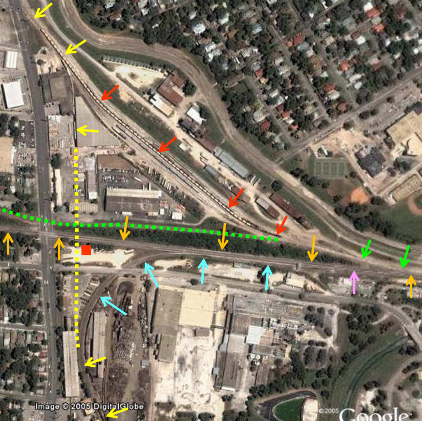 tracks and the green arrows mark the Katy tracks. The yellow arrow
