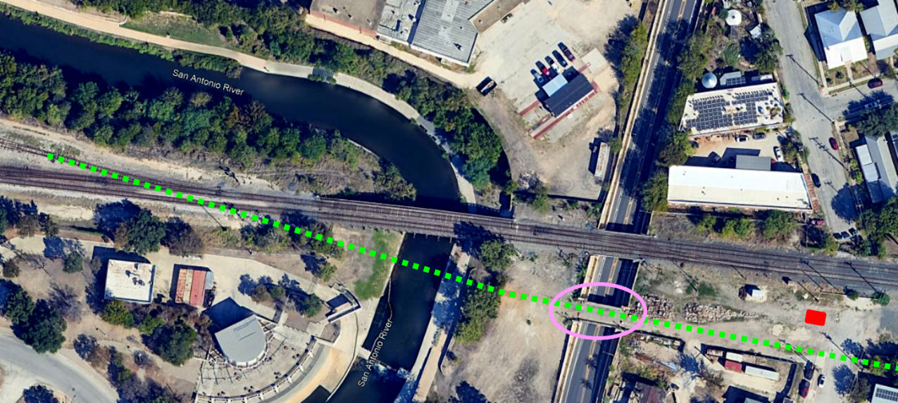 the location of the tower (red rectangle) and the path of the Katy tracks (green