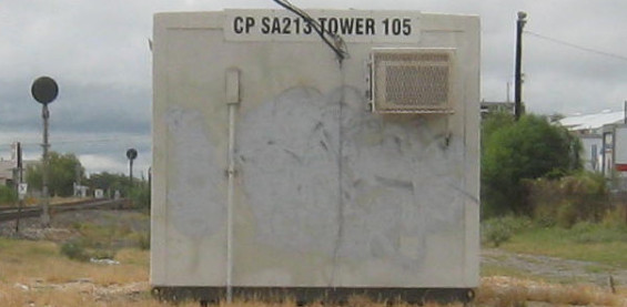 Tower 32, etc.) A. Tyrrell Kott adds... "Tower 105 was painted yellow and brown. This is the T&NO/SP paint scheme. Note that the moveable window sashes are white. The tower has brown screens that obscure this fact, but one window is open and you can see the white sash." Below: Based on historic aerial imagery, Tower 105 was closed in the 1966-1973 timeframe. By 2009, this equipment cabinet located on the north side of the tracks was providing the Tower 105 functionality. (Jim King photo, 2009) ![]() |