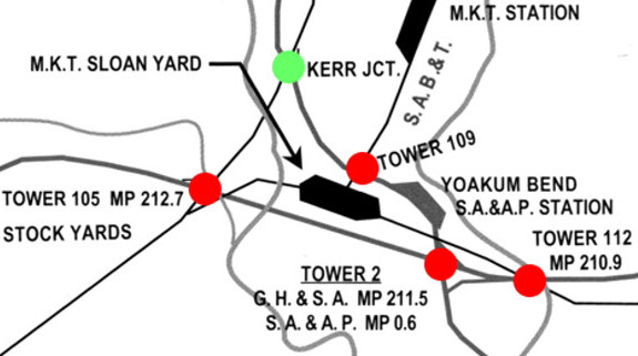(off the map to the north) controlling the SA&AP crossing and the Katy's depot lead.